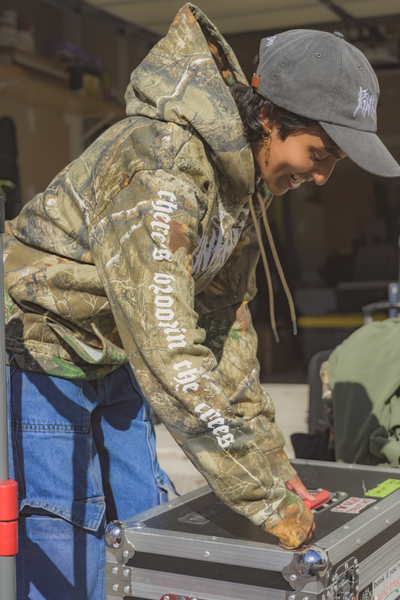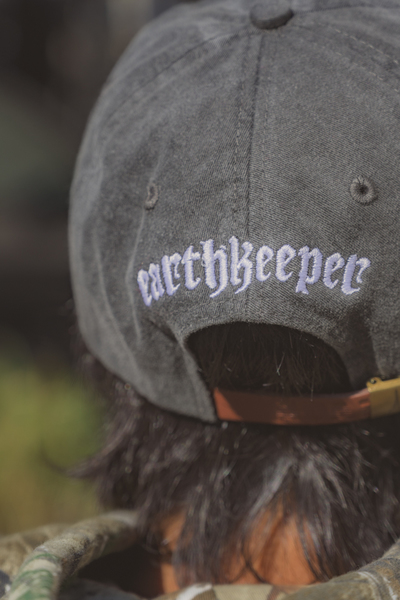 Grey Adams™ brand baseball hat with Pinkshift logo embroidered on front in white, and "earthkeeper" embroidered on back in white, with brown leather adjustment strap