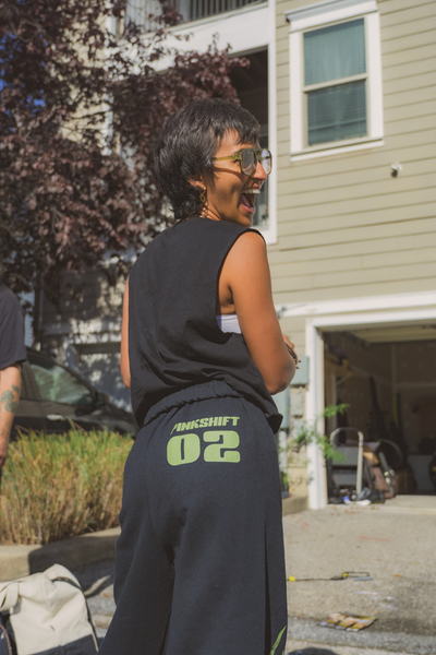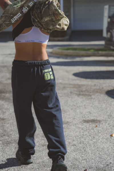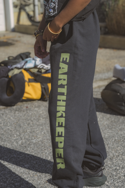 Black cotton sweatpants with "Earthkeeper" logo on the leg in Green